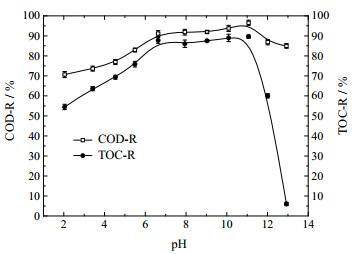 從圖可以看出,其它條件不變,當進料pH在2.00~6.63時,COD和TOC去除率隨著pH的增大而快速增高,此階段為臭氧直接氧化占主導地位,主要發(fā)生初始快速反應[18-19];當進料pH在6.63~11.00時,COD和TOC去除率均達到較高水平并隨著pH的增大而提高,在進料pH為11.00時分別達到 很高去除率96.56%和89.63%,此階段為自由基間接氧化占主導地位,不僅發(fā)生初始快速反應,更進行了深度慢速氧化反應[19-20];當進料pH高于11.00時,隨著進料pH的增大,COD和TOC去除率均迅速下降,這是由于少部分苯酚被深度氧化為CO2在強堿性體系中轉化為CO32-及HCO3-離子,抑制了苯酚的氧化過程[19]。由此說明, 很佳為進料pH為11.00。